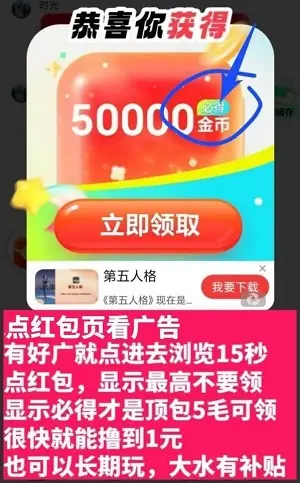 3.红包领取技巧:红包奖励上限50000金币,右上角显示“必得”字样再领取,看完一个视频广告点击“继续变大”,用叠包玩法,直到满5万金币再领取,避免浪费奖励。如果初始红包弹窗不是“必得”,而是显示“最高”时需提升账号权重,多刷刷广告、多参与其它活动养号。