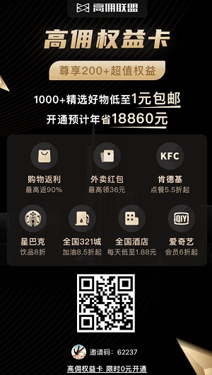 高佣联盟APP是一款可以购物返佣、购物领优惠券的手机软件,推荐好友购物还能赚钱,微信扫码直接注册,邀请码:62237。自买省钱,分享赚钱。支持淘宝、拼多多、京东等各大购物平台,只要有消费就能同时获得收入。