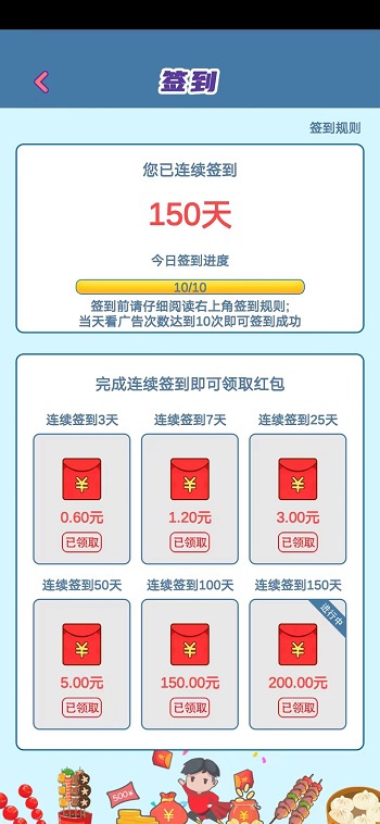 我的小吃街App是一款小游戏,玩法非常之简单,可以说适合所有人,下载登录签到,连续签到最高可与获得360元的现金奖励,同时我们合成升级摊位、增加繁荣度、合成小吃还可以直接兑换现金,玩法新奇并且比较有意思的赚钱小游戏,大家可以去试试~