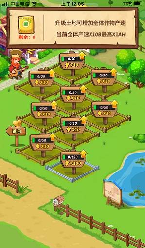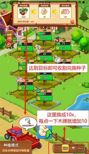 注意:刚开始玩,不用着急去收割,拿到金币和肥料先【升科技】和【升级土地】