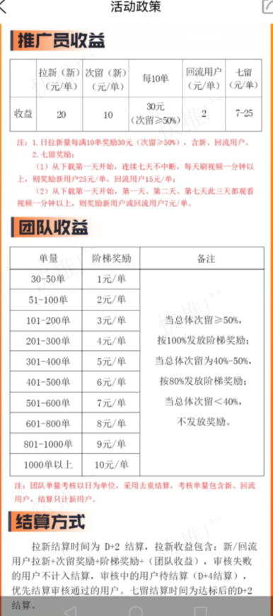 首日下载20元 次留10元 七留最高25元 团队收益10元 留存奖励3元,合计最高价格68元每单,这个奖励比起同类是高出非常多的,留存要求就是每天看视频1分钟即可激活,建议起码完成次留,可以拉个群第二天发红包,只要用户完成次留,收益就基本翻倍了,七留的话看个人喜好,确实有点难度!