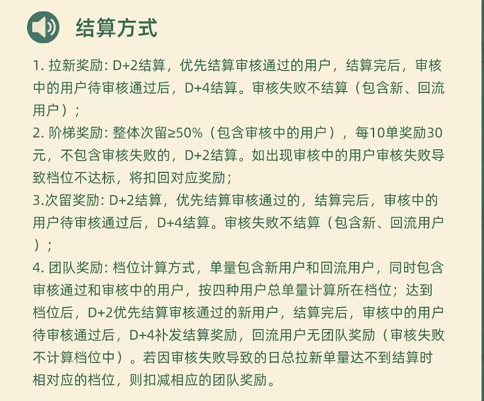 因为平台是有次留和七留的规则,所以没部分收益审核入账的时间自然是不同的,快推广审核都是D 2机制(审核周期为2天),简单说首日拉新奖励就是第3天入账,次留是第4天,七留收益则是第9天。