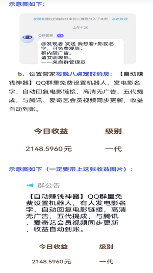 简单说所谓的挂机功能,就是我们创建群或者联系合作群主,把七猫影视机器人拉进群里设置好成为管理,之后每天定期会推送影视资源,并且只要群友发送关键词,就会主动推送相关的影片,我们无需手动发布资源,所谓的挂机就是这回事!我们要做的就是多拉人进群!