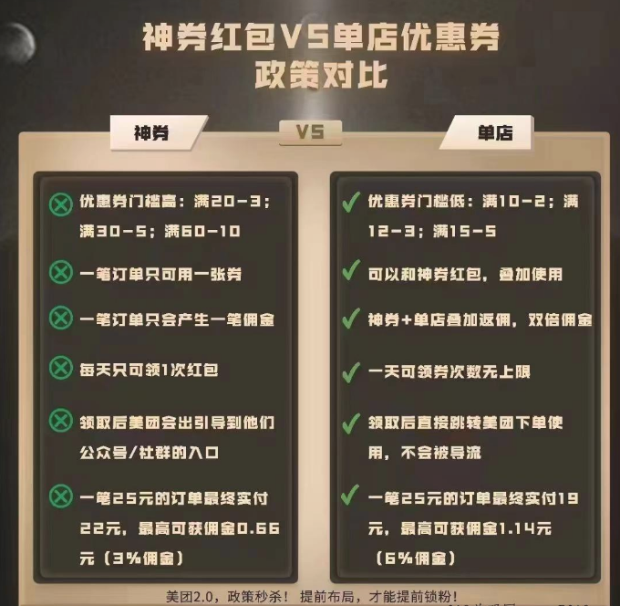 首先我们来分析一下目前市场外卖现状:美团现在变革,第一玩自己的私域流量,他们建立自己的社群,所有平台或者团队长的粉丝在领取神劵红包的时候,都会跳出来美团社群链接,让粉丝进入他们自己社群,同时美团在自己的社群发他们自己的神劵红包,结果让所有平台和团队长的粉丝被永久锁定在美团的社群里!平台和团队长在没有粉丝的同时收益大幅度降低!另外美团大幅度削减神劵红包佣金,目前佣金在0.1%—3%之间浮动。进一步削减了各大平台和团队长收益,导致了目前外卖市场一片惨淡。目前所有在做这一行的要么转行要么在寻求新的突破点。