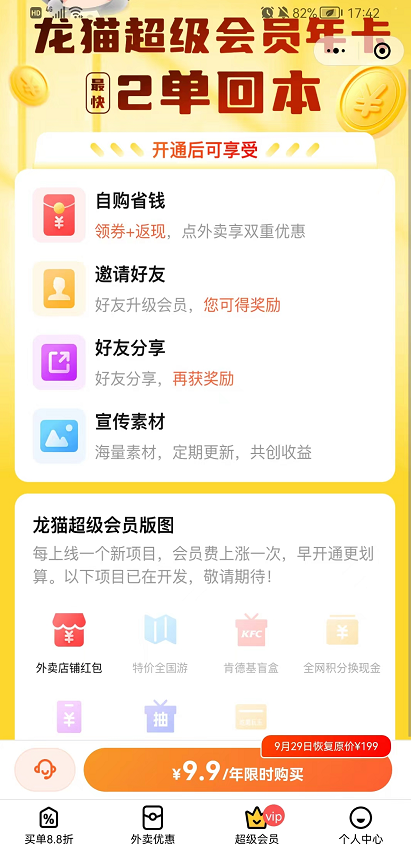 目前是早期内测,所以目前开通资格需要9.9元,其实也就是2顿外卖的优惠,如果你做推广自然可以开通,如果你经常叫外卖自用也是划算的!