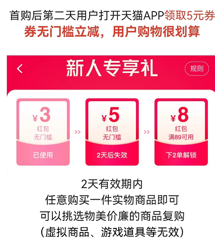 一、提醒用户次日登录APP可领取一张5元优惠券,次日复购只要在手机天猫直接下单即可,复购不需要再扫拉新码。