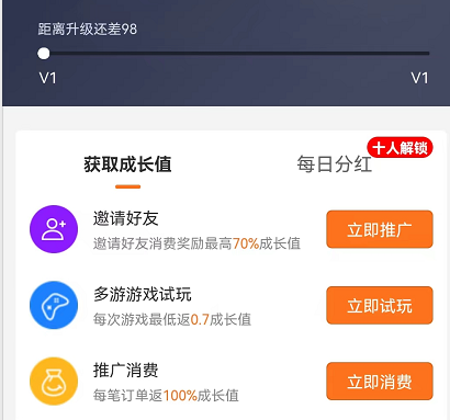 我们玩试玩游戏,推广好友消费,或者是自己消费都可以获得成长值;简单说赚的越多,成长值越高,另外每推荐一个下级可以获得2成长值,但一定不能放单这个平台是肯定会封号的!