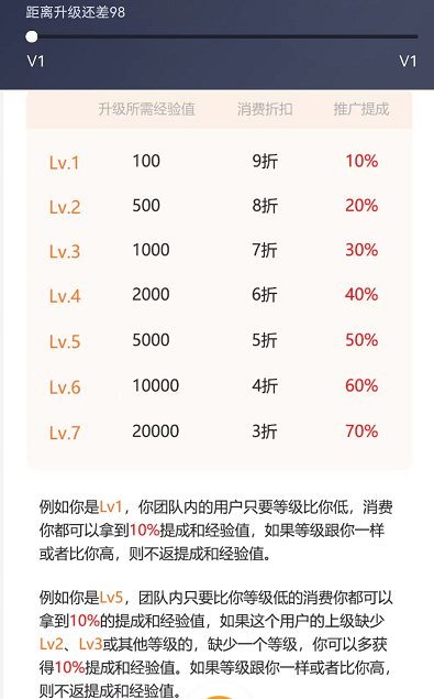 根据成长值的不同,我们可以升级,级别越高我们自己消费就优惠越大,并且提成比例也是越高,这里注意提成不是直推提成,而是团队级差提成,简单说就是只要你级别比别人高就可以一直获得所有团队下级的消费佣金!