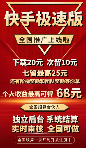 快推广APP做的是全国裂变版的拉新,对比北方和南方版本,整体价格更高!而且推广也更暴力!根据目前政策,快推广APP快手极速版拉新价格总计68元,绝对是全网最高的存在!