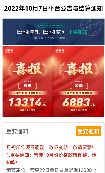 首先我们要注册一个任推邦APP,这是目前市场上最好的网推/地推综合性拉新平台,有海量优质独家任务价格置顶,并且提现是0门槛0手续费的,体验特别棒,笔者这边对接的首码价格会更加有优势!