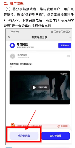 “分享资源链接给用户——→用户保存在自己网盘内——→提示需要注册账号——→保存成功——→下载APP——→查看资源”