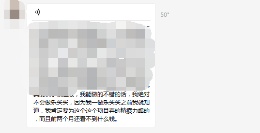 这点也是很重要的因素,大家应该知道做电商来钱相对比较慢,如图笔者跟朋友推荐项目的时候看到她在做这个乐买买了,于是也顺便交流了一下,首席这位朋友其实相当有人脉,之前做地推曾经一天好几千收入,结果那边的反馈是做了2个月基本看不到什么钱【她之前有做好省,所以首码很早就参与内测了】,只是骑虎难下想放弃又不大好,这其实也算是对大家的一个忠告了!