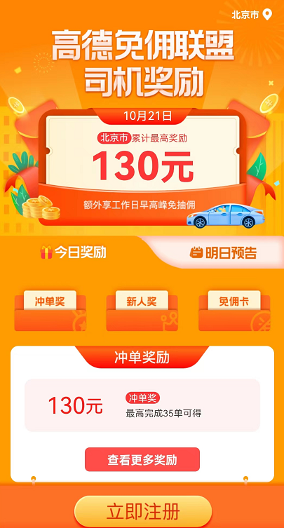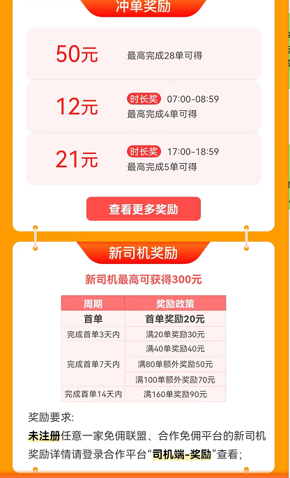 免佣联盟新司机限时享优先派单等专属权益,指定城市免佣联盟新司机享免佣和新司机专属冲单奖励,新司机最高奖800元。 (各城市or网约车平台具体政策略有差异,以注册城市和平台为准,具体可看。比如北京是130左右,而广州就是80多,所以不同地区拉新价格会有区别!