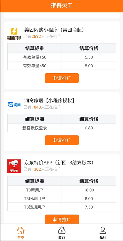 首先,我们登录APP首页就可以看到目前上架的全部任务,并且有详细的分门别类,根据自己喜好即可挑选都是高价项目。这里注意下,每个不同的任务一般都需要手动进入报备申请推广,申请之前可以仔细查看该任务教程,都有详细的图文甚至视频说明,这样就可以判断任务难度和性价比是否适合自己操作了,规则和注意事项一定要多看,比如有的任务要求只能地推或者有地域限制那就得依照规则操作,否则很可能不会结算!