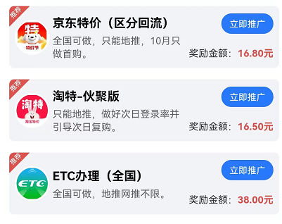 快推盟APP是一款结合了地推 网推形式的综合性拉新推广平台,像这类的平台其实大部分项目网赚圈子里的网友已经有注册过,所以不太适合薅羊毛,但可以搭配放单网推或者线下地推的形式放大收益,主要是用来量化操作赚圈外钱的!当说实话,同类软件里对比快推盟APP其实比较一般,有明显更优质的平台!