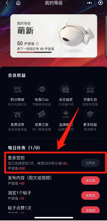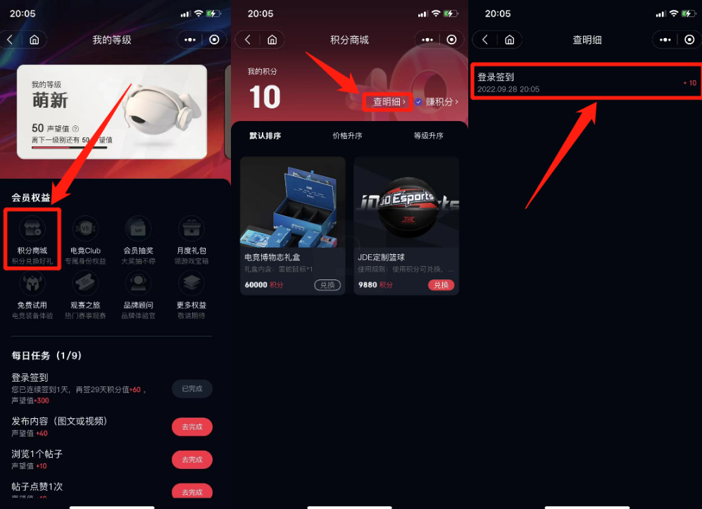 4、签到完成后点击”积分商城“,点击”查明细“,查看当前签到日期是否为首次登录签到日期:如果是则为新用户;有其他签到日期则为老用户
