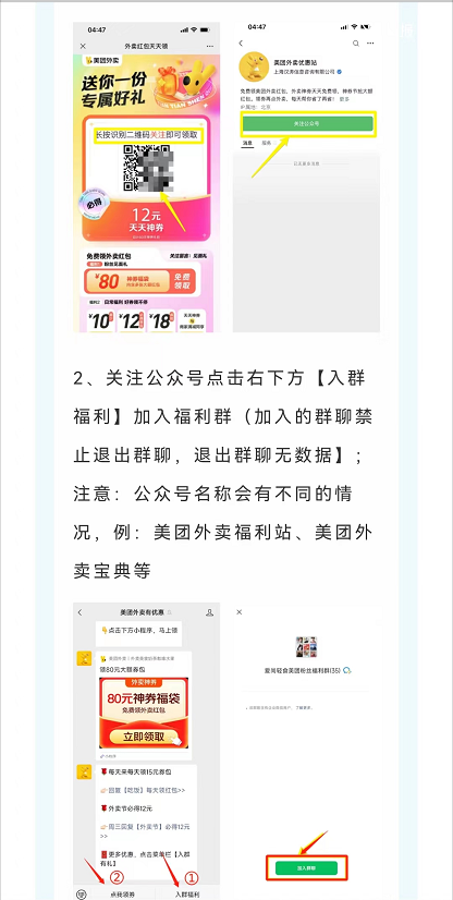 注意:公众号名称会有不同的情况,例:美团外卖福利站、美团外卖宝典等
