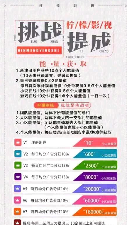 柠檬影视APP根据我们小区能量值的多寡来划分VIP级别,从新人的V1到最高级的V7,只有是V2以上都可以获得平台合计80%的利润分红,所以我们需要尽量保证团队活跃度同时发展裂变,那么升级就不会太难,比如V2实际理论需要最少60人,而V3理论最少需要团队250人,都是计算整个团队所以并不算太难!