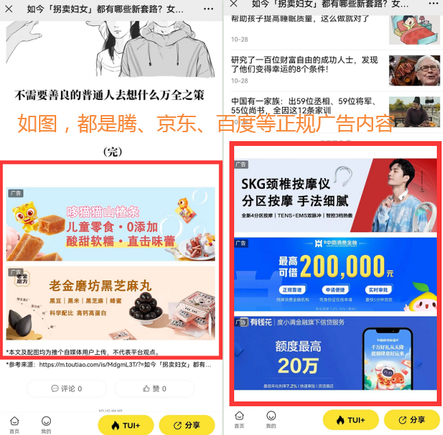 其实只要涉及分享转发或者点击的项目,本质上90%都是广告曝光收益,而过去一些转发文章项目价格虽然高但扣量也很多,重要的是里面对接的广告都是灰黑色产业,所以长久不了,也事实上确实如此;而推个的文章,大家转发一篇就知道,里面对接的都是京东的商品、腾讯的产品、百度的有钱花等等,都是正规大厂旗下的,虽然可能单价低一些,但绝对绿色正规,这样我们才能长期有收益!