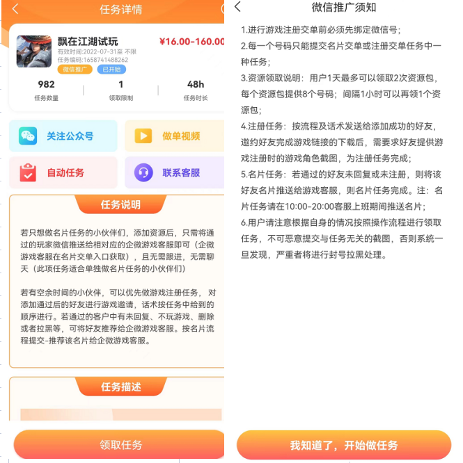 简单说,旺星猫的加粉任务其实就是去推广网络手游的,目前推广的叫【飘在江湖】;平台每天会给2组合计16个手机号让大家去加好友,也不需要要拉群什么的操作;加上之后我们可以选择名片交单或者注册交单,有2种赚钱模式!