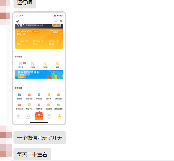 当然不同模式收益是不同,如果是自己推广用户下载软件没人有10块钱;如果是推给客服就只有一块钱,所以看自己选择,推给客服是轻松但是每天估计也就一共赚10块8块差不多了;如果有时间,还是建议尝试自己去推广,如图这边网友反馈,一天里面有9个通过的,其中3个人下载了游戏,合计赚了36元当天,那真是相当不错!