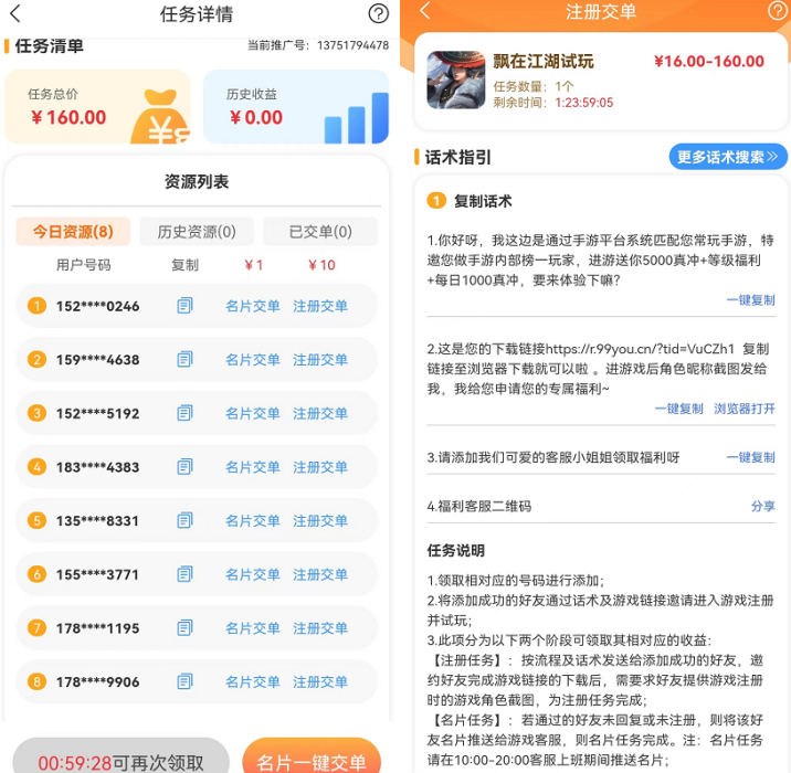 旺星猫平台如果你想挣钱,主要就得做游戏推广员,其中一个任务【游戏推广】,理论上每天收益可以达到16-160元;简而言之,就是平台会每天给我们提供能16个联系微信,都是玩游戏的优质意向用户,所以平台给我们提供潜在客源,所以也并不需要人脉!