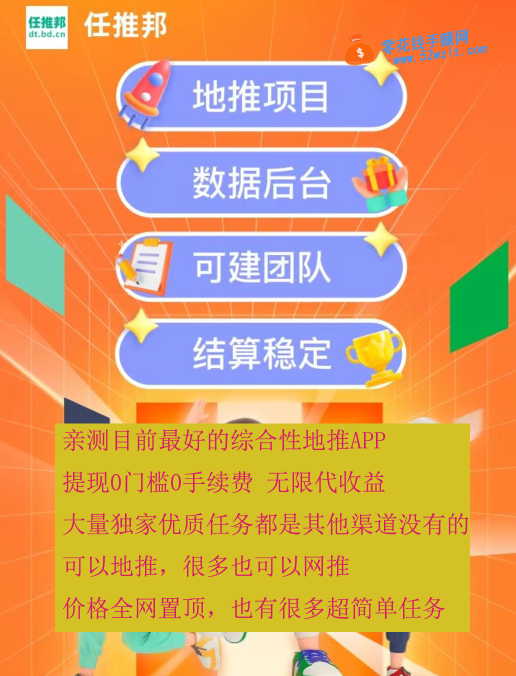 从这几点看来,说任推邦是目前最好最有前景的地推拉新平台一点都不夸张,笔者独家对接官方首码,全网最低抽成,欢迎团队长对接!
