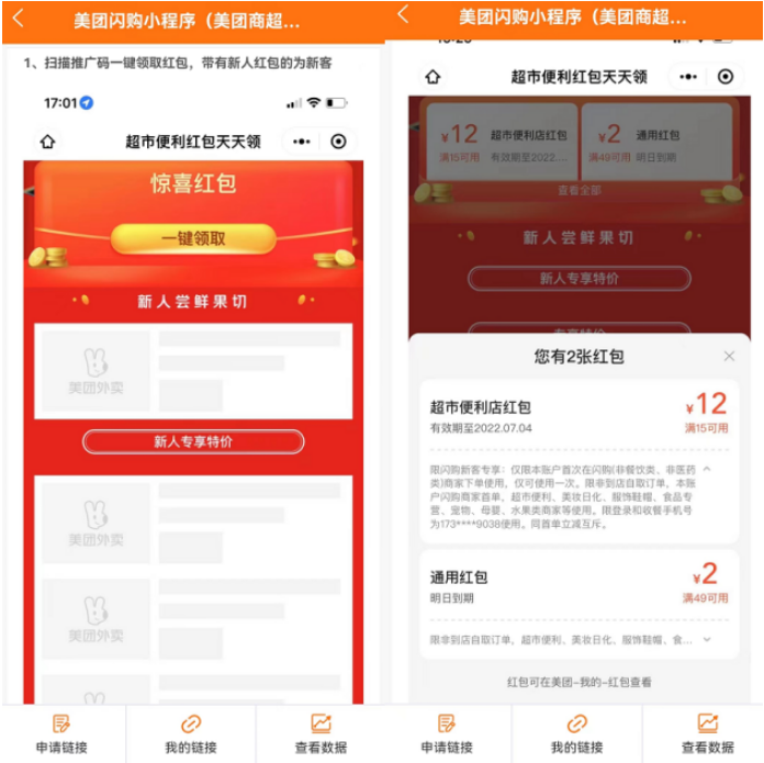 1、扫描推广码一键领取红包,带有新人红包的为新客