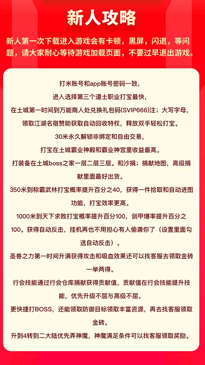 建议进入选择第三个道士职业打宝最快(前期最重要的就是一定要升等级,游戏等级越高,每天低保金砖就越多),打宝在土城霸业神殿和霸业神宫里收益最高。打装备在土城boss之家一层二层三层。和沙捐;捐献地图,高级捐献里面最好出货。
