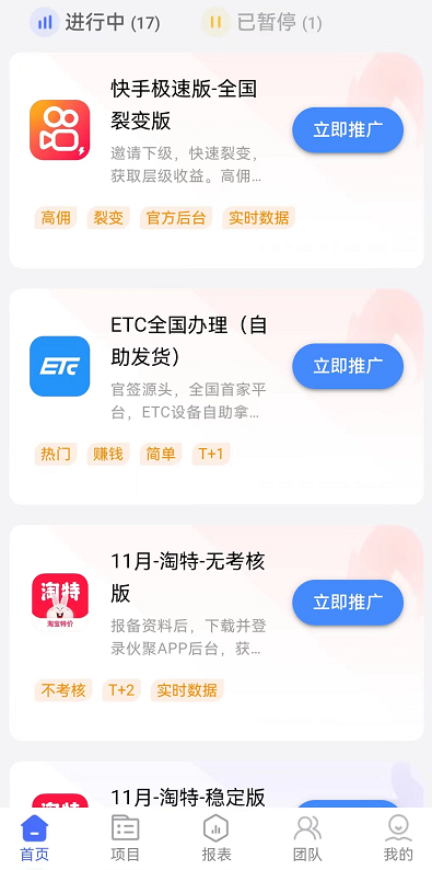实时截图一下街推联盟里面的情况,基础的任务还是基本有的,目前上线整体任务17个,不过不失吧!基本常见的项目都有,但是也没什么特别的项目,这方面突出的软件一般有合计30个左右的任务,就会有一些几乎是独家的任务,操作性价比会更高一点!