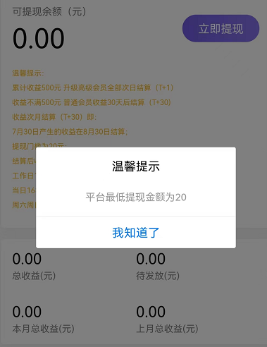 而平台也是这个原因结算周期较长,而有500块收益的用户就等于是平台经过考核筛选认定优质成员,所以T1结算,其实这个时候平台提前垫付给我们资金了,他自己都得第二个月才有钱,明白这个原理之后其实靠不靠谱就不言而喻了!