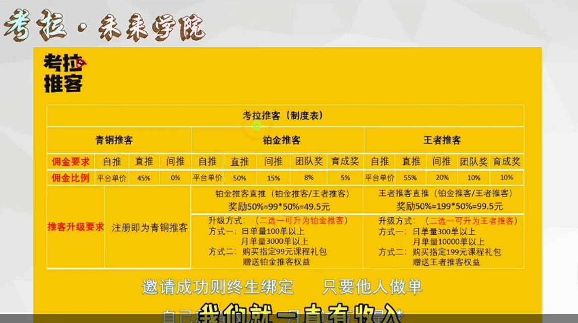 首先我们可以看到,考拉推客任务佣金所有人一样,另外还有一个奖金池,这个我们可以理解为就是团队收益分配的资金,所有人基础价格一样,但是还有直推奖励、间推奖励以及团队奖励育成奖励,简单说就是有无限代的收益,当然也是有一定门槛需要晋升铂金和王者推客才能获得最高推广利润。