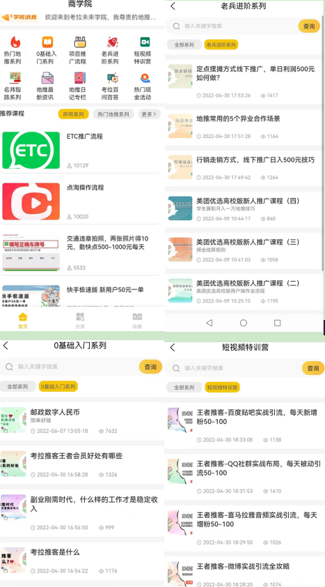 在此精心准备的课程扶持之下,无论自己操作还是发展团队,考拉推客的用户无论粘度OR用户收入一定是明显优于同类竞品的