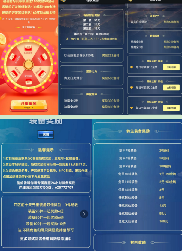 简单说盟重英雄之冰雪火龙除非卖装备挣元宝之外,这个版本还有一个叫【金砖】或者说类似代币之类的东西,简单说我们通过冲级、排行榜、每日签到、每日分享等途径都可以每日获取大量金钻,只要满100金钻就可以抽奖一次必得现金红包,最高是88-188元,这块收益一定不能小看!出售装备也会额外获得金砖。