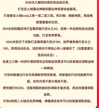 行会技能通过行会仓库捐献获得贡献值,贡献值在行会技能提升技能,优先升级不屈与高级不屈,可以更快捷打BOSS,还能领取防御目标领取丰富资源,再去找客服领取金砖。