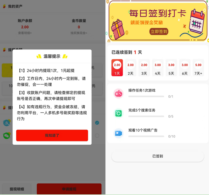 另外,不知道是平台BUG还是放水,注册进去签到就送2块钱,然后居然立马就可以提现【亲测已经到账】,个人感觉应该是签到有要求的,但是目前这些板块没上线,平台没设置好才会一天签到有几块钱,每24小时提一次就行了,后期可能会修复,尽快撸!