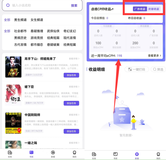 大家知道看小说的受众非常广,很多人都愿意花钱去下载小说观看,而紫鲨阅读的模式更加科学,从付费优化到可以选择付费可以选择广告解锁,转化率更高。而且本身就是现成的平台,不用抵押资金没有成本,比起完全自己搭建方便并且没有垫资风险(万一数据出毛病不结算,你可能就白干一个月,而现在风险都在平台方)