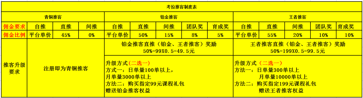 而考拉推客模式是不同的,虽然都是有团队模式,但平台里面所有都是一手置顶价格,全部人价格统一,如图,每个项目平台都拿出来部分金额作为奖金池,这个根据你级别和团队数量推广收益有区别,但是所有人做单价格是绝对公平的。