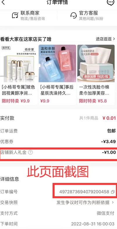 点“小编推荐”任意挑选一件商品,支付0.01元,订单详情页面截图