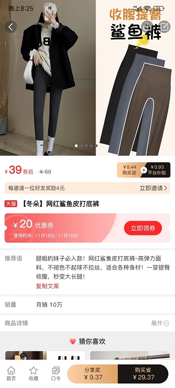 比如这个产品在天猫卖59元,通过这个平台可以领取一张20元的优惠券,再加平台返佣8.44以及平台补贴0.93,59的产品可以省下29.37,不到30元即可买到。
