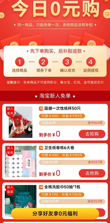 平台首页有个新人0元福利的入口,新注册平台的用户可以在这个活动界面挑选一件产品购买。