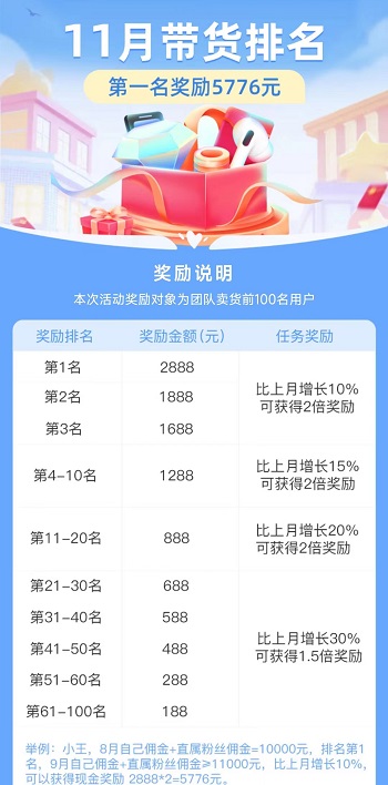 平台每个月还有一个带货排名奖,带货赚的越多,进前100还有额外的现金奖励,也算是额外收益了。