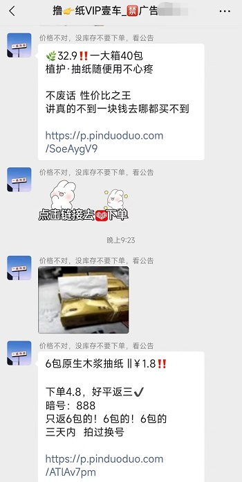 撸纸群也是非常好的引流工具之一,对于大部分人是很有吸引力的,因为纸巾作为大家的高日常高消耗品,使用量很大,而在撸纸群可以低价买卷纸和抽纸。