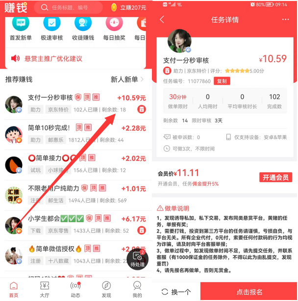 如图比如,首页【支付一分钱】这个任务,做的就是京东特价版的一分购任务,我们点进去任务里面【点击报名】即可参与任务,去应用商店下载【京东特价版】,然后扫描商家提供的推广码支付1分钱即可,这样操作其实全程5分钟左右就能完成,目前佣金是10 所以性价比特别高!对于任务完成难度和审核时间,我们可以参考完成时长以及审核时长,这两个是很决定任务性价比的,熟能生巧尽量可以优先选择快手审核类型,钱到手速度特别短只需要15分钟!