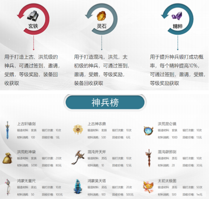 神兵锻造师的玩法模式很简单,我们通过游戏级别、游戏进度、邀请好友、每日签到等方式可以获得玄铁、灵石、精粹;通过这些素材我们可以锻造神兵,锻造神兵等级越高需要素材越多,同时也需要精粹(提高成功率)。