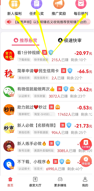 这里建议大家可以优先选择【快速审核】这类任务,1个小时内就会审核,哪怕商家不审核也会自动通过,实际上基本为了曝光量商家会尽可能秒审核,而且这种任务通常都是注册、下载、助力这类的简单任务,非常适合小白新人操作!