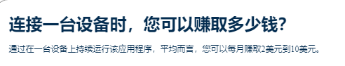 在我测试中,这个平台每月每一个设备,收益在2-10美元左右。