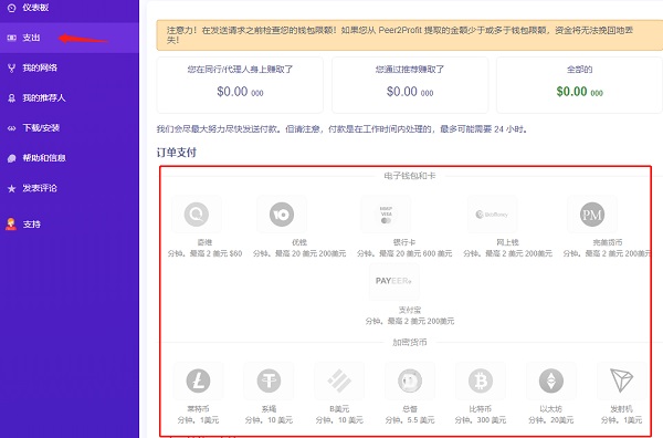 7、当达到一定的收入后,就可以通过首页,登录账号,左侧的工具栏,找到支出,点进去把自己的收益提现,提现的方式有多种,payple或者虚拟钱包等,最低1美元起提。
