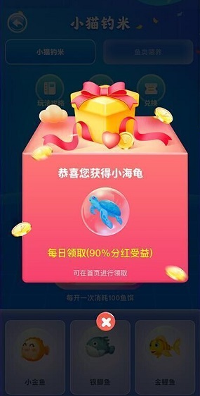 小猫钓米结合了钓鱼与搬砖的全新玩法!钓到的鱼可以直接兑换固定零钱奖励!取消了传统的随机兑换零钱的玩法,更多福利回馈用户!升级系统,可以直接对鱼儿进行升级,100%成功率!