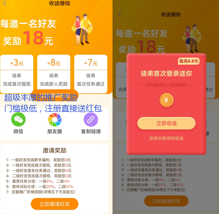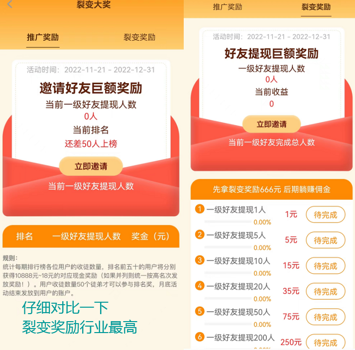 除此之外还有巨额的推广排行榜奖励以及裂变奖励,大家仔细对比其他软件【小桔悬赏】的福利是要高出一截的,本身还有直推8% 间推4%的佣金提成。